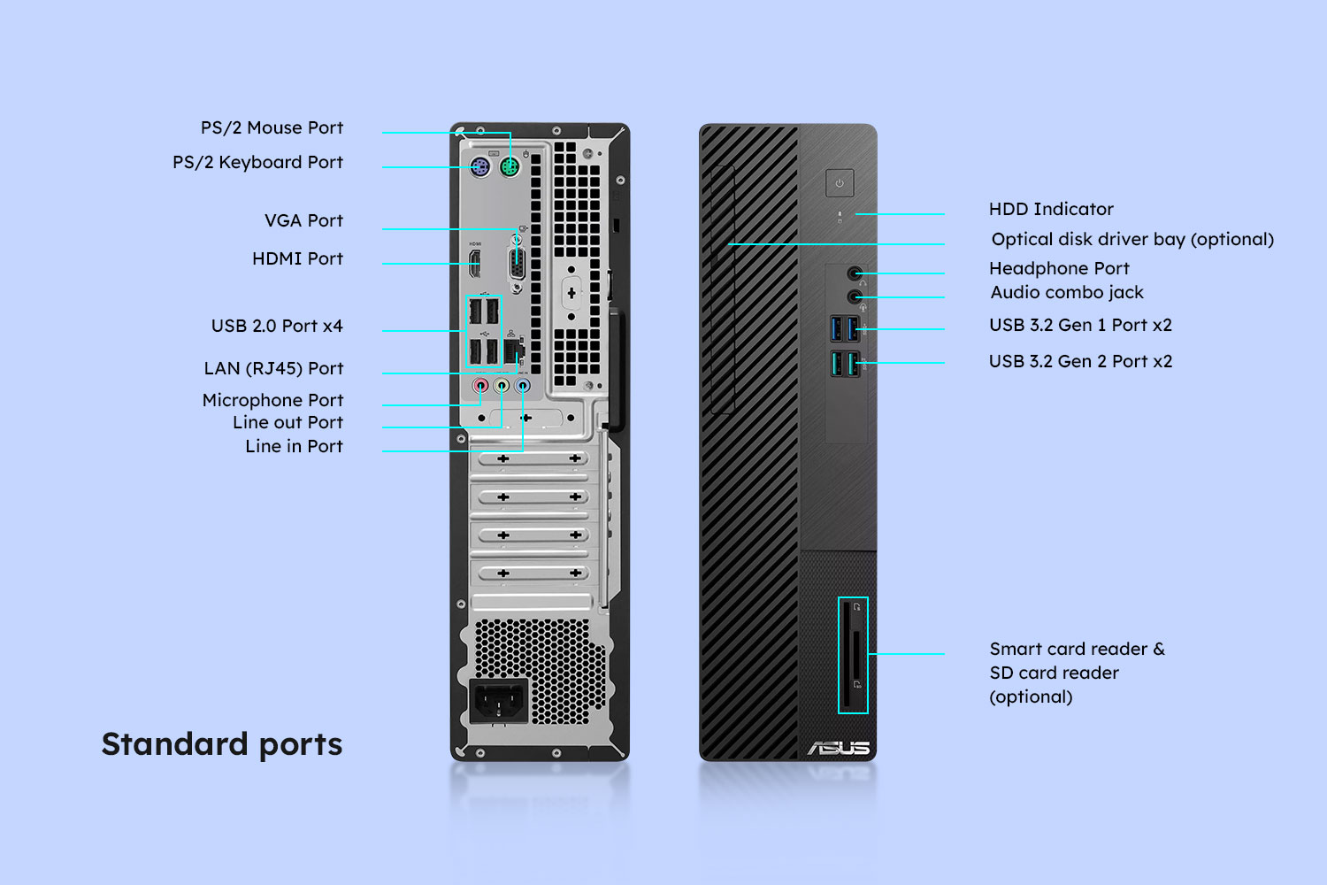 Chiếc PC Asus S500SE Tower được trang bị đầy đủ các cổng I/O, sẵn sàng kết nối ngay khi bạn cần. Bốn cổng kết nối USB-A và các cổng đầu ra âm thanh ở mặt trước thiết bị dễ dàng tiếp cận và thao tác nhanh chóng, khay đĩa quang tùy chọn giúp bạn lưu trữ dữ liệu và khe đầu đọc thẻ nhớ tùy chọn dễ dàng trao đổi, chuyển đổi dữ liệu.